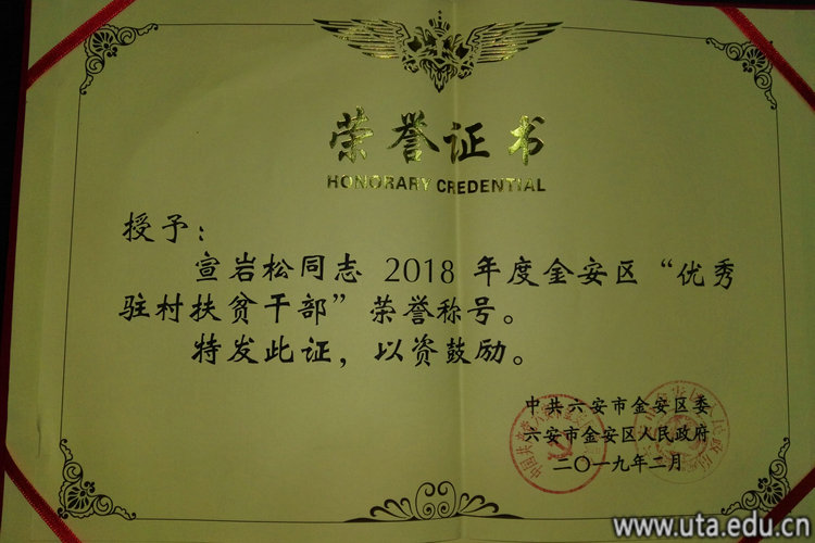 会上,金安区委副书记、统战部部长汪能武宣读了区委区政府关于2018年度金安区重点工作考评结果的通报,并对获得2018年度金安区先进集体和先进个人进行颁奖表彰。我校驻帮扶村--六安市金安区三十铺镇胡大楼扶贫工作队队长、第一书记宣岩松荣获2018年度金安区“优秀驻村扶贫干部”荣誉称号。这是我校驻村扶贫工作队继2017年度获得金安区委、区政府表彰为“优秀驻村扶贫干部”之后,再次获此殊荣。