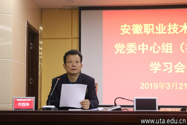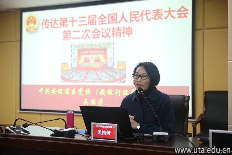 本网讯(党委宣传部 孙静)3月21日下午,学院在图文信息中心九楼视频会议室召开党委理论学习中心组扩大会议,专题学习全国“两会”精神。会议特邀第十三届全国人大代表、中共安徽省委党校党史党建教研部副主任吴梅芳教授来校作专题辅导报告。党委书记亓四华,党委委员、副校长史锋、陈行,党委委员、基础教学部主任马纯,党委委员、组织部部长杨林国出席会议,学院中层以上干部、各党支部书记及马克思主义学院专兼职教师参加会议。会议由亓四华主持。