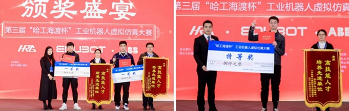 在总决赛现场,我校的两名选手顽强拼搏,冷静答题,细心操作,在规定时间内出色地完成了工作任务,以绝对优势斩获了冠亚军。其中,黄保乐同学获得特等奖,并获奖励8000元,俞静同学获得一等奖,并获奖励5000元,他们同时也取得了哈工大机器人集团校园招聘绿色通道的资格。