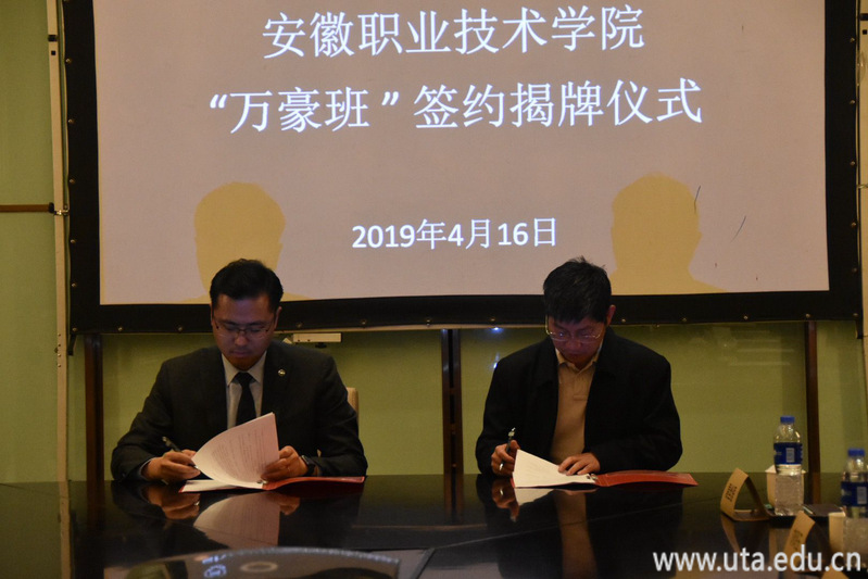 校企双方代表杨林国与刘云啸签定校企合作协议并揭牌。
