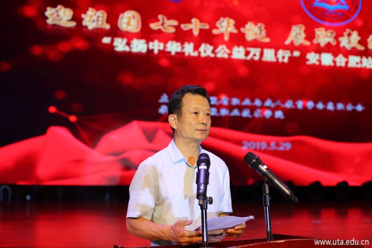 本网讯(院团委通讯员 徐李莉 史歌)为弘扬中华礼仪文化,展现时代职业风采,提升全民素质, 振兴民族精神,5月29日下午,由中国职业技术教育学会发起的“弘扬中华礼仪公益万里行”安徽合肥站启动仪式在我校大学生活动中心隆重举行。中国职业技术教育学会人文素质教育专委会副会长、礼仪文化教育研究中心主任蔡少惠,合肥新站高新区社会事业局高教处处长陶跃红,学院党委书记亓四华及相关职能部门负责人出席活动。启动仪式由副校长陈行主持。
