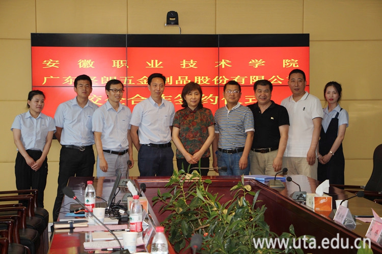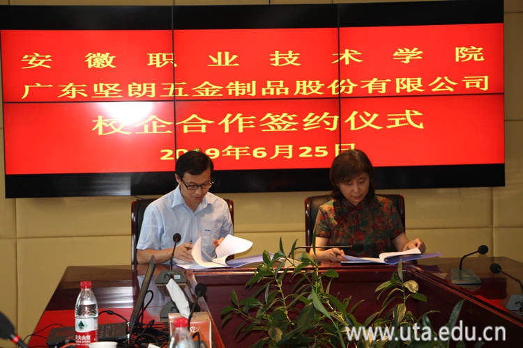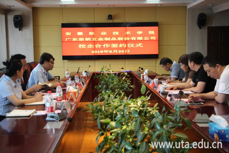 本网讯(财经商贸学院通讯员 沈京)6月25日上午,我校与广东坚朗五金制品股份有限公司订单班签约仪式在九楼会议室隆重举行。广东坚朗五金制品股份有限公司合肥分公司总经理董玉磊,总公司人力资源中心部长付立青,合肥分公司订单管理部部长王文静、区域经理叶道超、武淼淼,党委委员、副校长史锋,财经商贸学院党政负责人等出席签约仪式。仪式由财经商贸学院院长刘玉杰主持。