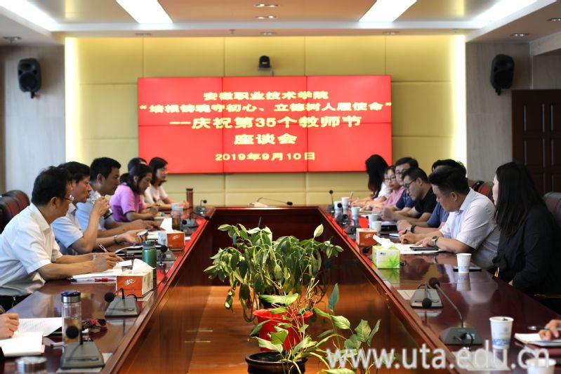 本网讯(人事处通讯员 程义进)为庆祝中华人民共和国成立70周年,弘扬新时代尊师风尚,9月10日下午,我校召开2019年教师节座谈会,庆祝全国第35个教师节。来自教学、科研、管理、服务一线的教职员工代表欢聚一堂,共话佳节抒情怀,建言献策谋发展。学院党政领导班子成员、办公室、组织部、宣传部、教务处、人事处、学生处、科研处、后勤管理处等部门主要负责人参加了座谈会。座谈会由党委书记亓四华主持。