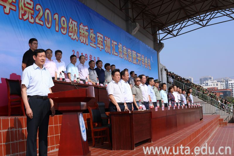 本网讯(校办公室通讯员 刘丽丽)金秋时节,丹桂飘香。9月30日,学院在校田径场隆重举行2019级新生军训汇报表演暨开学典礼。党委书记亓四华,党委副书记、校长孙敬华,合肥市瑶海区人武部部长丁秀雅,党委委员、副校长史锋,党委委员、副校长陈行,合肥铁路工程学院校长、铁道学院院长朱国苗,党委委员、基础部主任马纯,党委委员、组织部部长杨林国,安徽能源技术学院党委副书记、副校长、能源工程学院院长程琦琳及学院各职能部门主要负责人、各二级学院院长、党总支书记,2019级6000余名新同学出席典礼。军训汇报表演暨开学典礼由孙敬华主持。