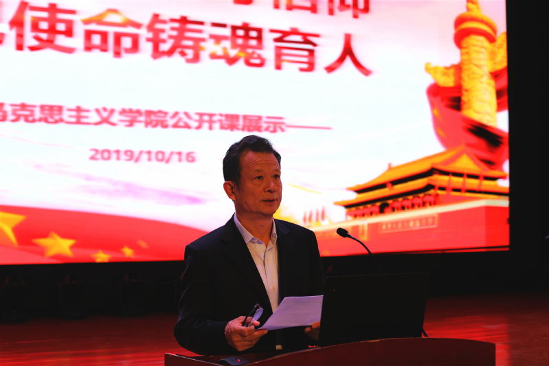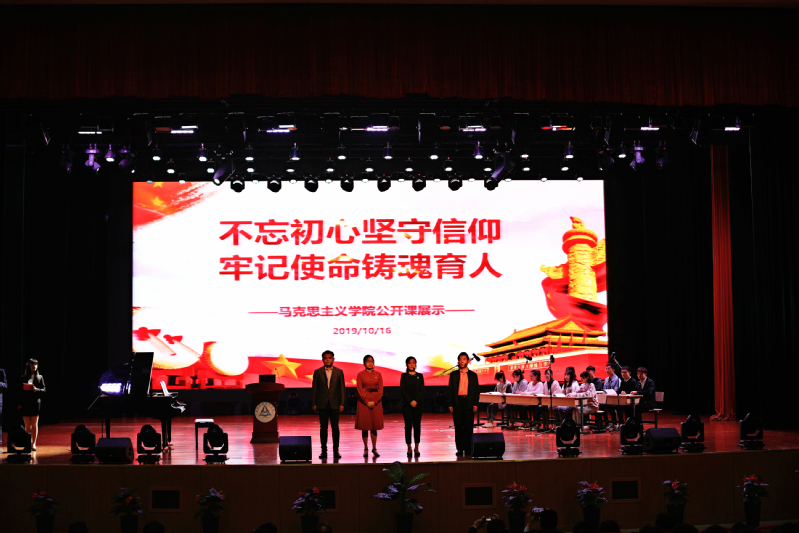 本网讯(马克思主义学院通讯员 李祥祥)七十年波澜壮阔,七十年风雨兼程;初心如磐、使命在肩。为学习贯彻习近平总书记《在庆祝中华人民共和国成立70周年大会上的讲话》精神,深入开展“不忘初心、牢记使命”主题教育,学院组织部、宣传部、教务处、院团委、马克思主义学院于10月16日在大学生活动中心联合举办了“不忘初心坚守信仰,牢记使命铸魂育人”思政公开课展示活动。党委书记亓四华,各党总支书记、二级学院团总支书记,马克思主义学院专兼职教师,学生代表共计800余人参加了活动。