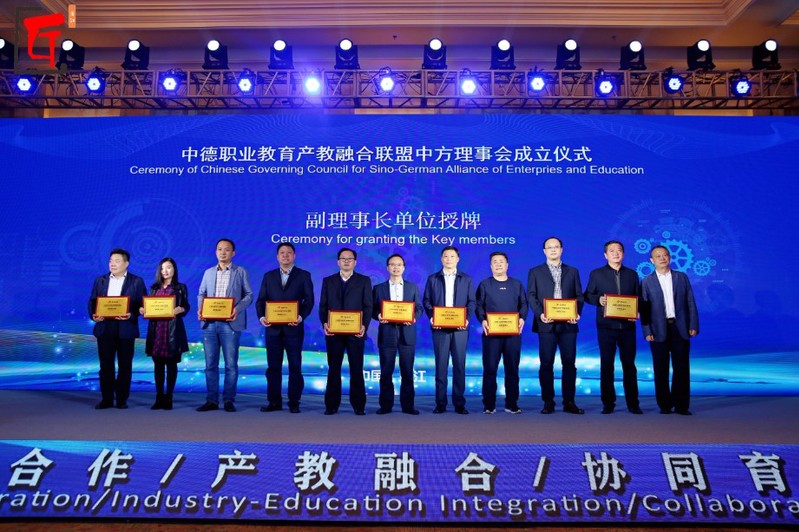 当天中德职业教育产教融合联盟仪式上,通过了《中德职业教育产教融合中方理事会章程》,明确了联盟的服务宗旨,成员单位的权利和义务、经费与财产管理等事宜,并制定了联盟2019年-2020年年度工作计划。我校作为联盟的副理事长单位之一,在当天的仪式上,获得了正式授牌。