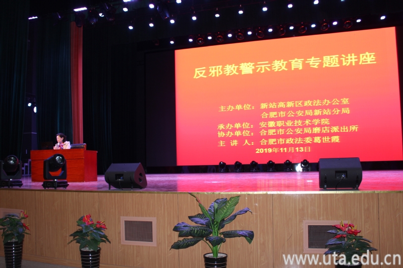 本网讯(保卫处通讯员 王胜璋)2019年11月13日下午,由新站区政法办公室和新站区公安分局主办、亚星游戏网承办、新站公安分局磨店派出所协办的“反邪教警示教育专题讲座”在我校大学生活动中心进行。参加本次讲座的有各二级学生学生和辅导员代表,保卫处、党委宣传部、学生处、院团委工作人员,磨店派出所部分公安干警,新站区五大辖区的部分宗教干部。讲座由合肥市政法委副调研员葛世霞同志主讲。