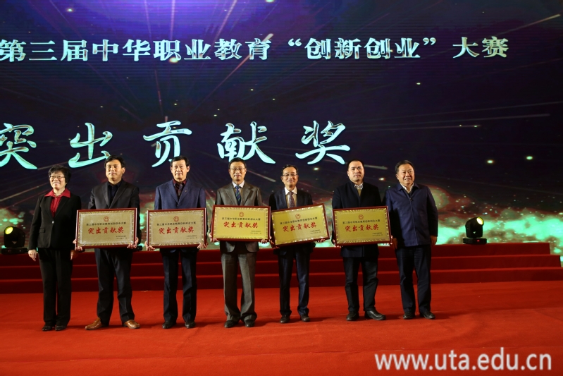 11月18日,大赛颁奖晚会在合肥北城世纪金源大酒店隆重举行。全国人大常委会副委员长、中华职业教育社理事长郝明金出席颁奖仪式并发表了讲话。中共安徽省委常委、统战部部长刘莉,中共安徽省委常委、合肥市委书记宋国权,安徽省人民政府副省长王翠凤,安徽省政协副主席、民建安徽省委主委、安徽省中华职业教育社主任李修松,安徽省人大常委会副秘书长郭再忠,中华职业教育社副理事长苏华,中央纪委国家监委驻中央统战部纪检监察组副组长李沛,中华职业教育社党组书记、总干事方乃纯,中华职业教育社党组成员、副总干事李英爱,安徽省教育厅副厅长解平,安徽省人力资源和社会保障厅副厅长刘少华,安徽省农业科学院副院长赵皖平,中共合肥市委常委、统战部部长陈晓波,长丰县委书记许华等领导出席会议并为获奖选手颁奖。党委副书记、院长孙敬华受邀出席了晚会,并代表学院上台领取了第三届中华职业教育创新创业大赛“突出贡献奖”。