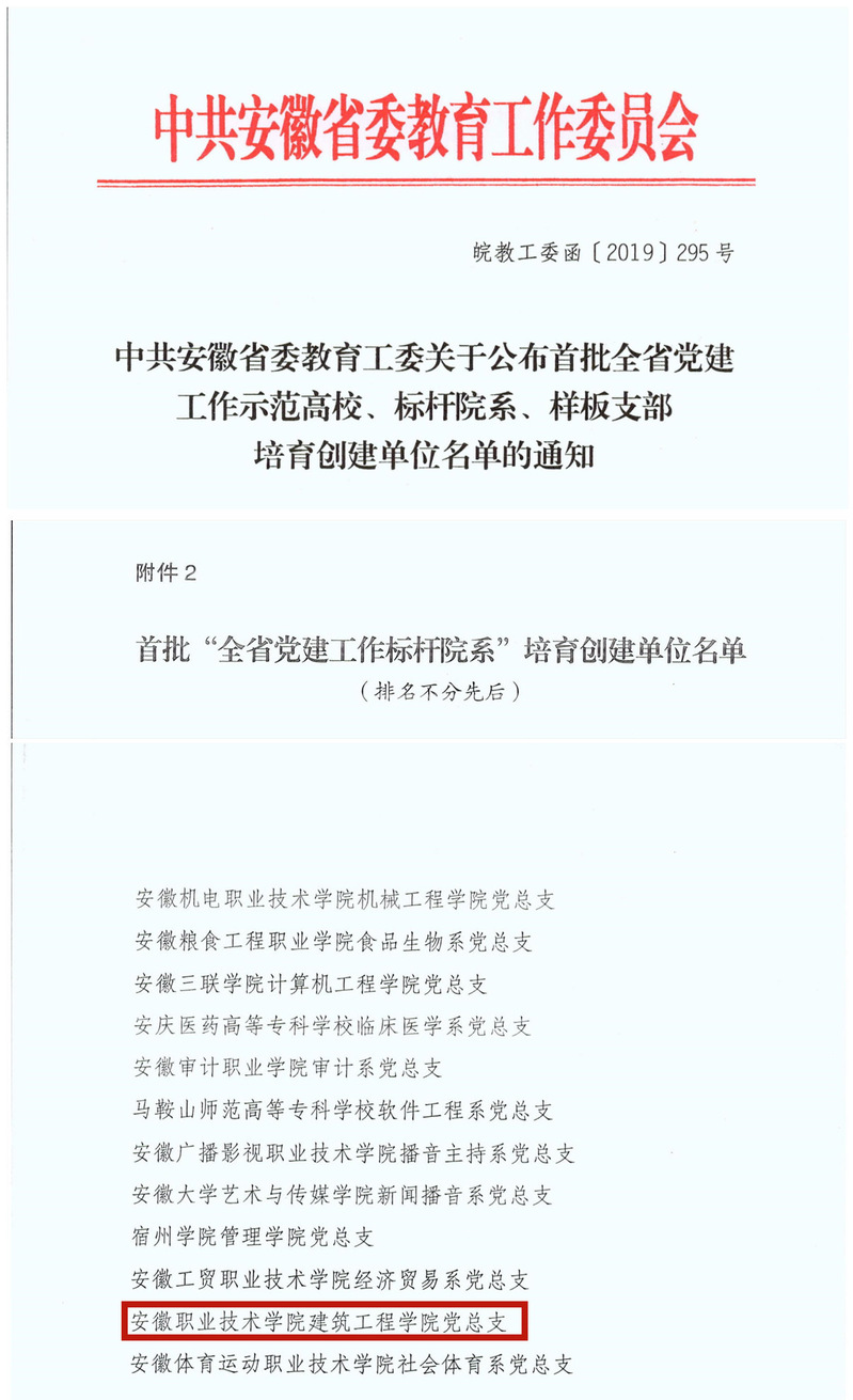 本网讯(党委组织部通讯员 杨娟)近日,省委教育工委公布了首批全省党建工作示范校、标杆院系、样板支部培育创建单位名单(皖教工委函〔2019〕295号),我校建筑学院党总支和马克思主义学院直属党支部分别成为首批全省党建工作标杆院系和样板支部培育创建单位。