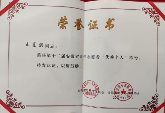 王夏洪同学作为一名预备党员,品学兼优,勤奋刻苦,在努力学习文化知识的同时,积极投身各种志愿服务活动。两年多来,她参加校内外志愿服务活动40余场,“志愿中国”记录服务时长超过100小时。在校期间荣获志愿者“月度之星”、省直大中专院校“优秀志愿者”、合肥市百千万志愿者结核病防治知识传播行动“优秀志愿者”等荣誉。