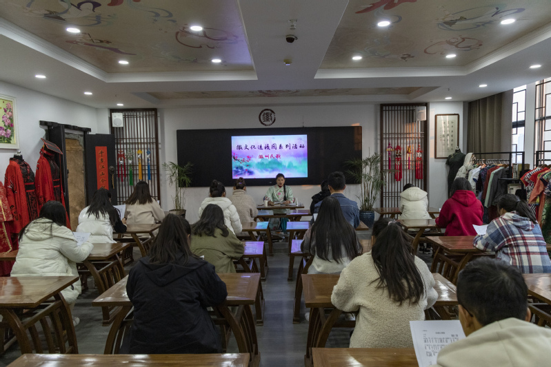 活动上,余立瑛边讲边唱,同学们边听边学;余立瑛唱得宛转悠扬,同学们听得津津有味,一首首一句句承载着徽州故事的歌词将大家一起带回梦里老家。