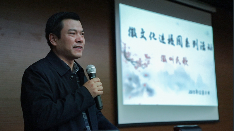 陈行在活动开始时致辞。他代表学院对受邀参加传唱的传承人余立瑛老师表示欢迎和感谢,并表示在学院立德树人过程中,要充分发挥和利用好传统文化在育人中的重要功能。安徽文化底蕴深厚,其中徽州民歌是徽文化中的一颗璀璨明珠,是扎根于徽州大地文化土壤、吸收徽州文化滋养而生长出来的艺术之花。它不仅仅有艺术美育价值,也有浓郁的人文特色。此次活动邀请余立瑛老师,走进校园与师生面对面举行传唱活动,是落实学院以美育人、以文化人工作部署的一项实际举措。陈行希望同学们用心聆听,认真学唱,与传承人一起传唱经典古韵。
