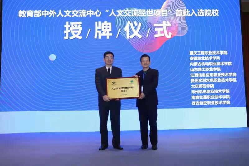 会议举行了“人文交流经世项目”首批“经世国际学院”入选院校授牌仪式,党委书记亓四华代表学院接受了教育部中外人文交流中心杜柯伟主任的授牌。