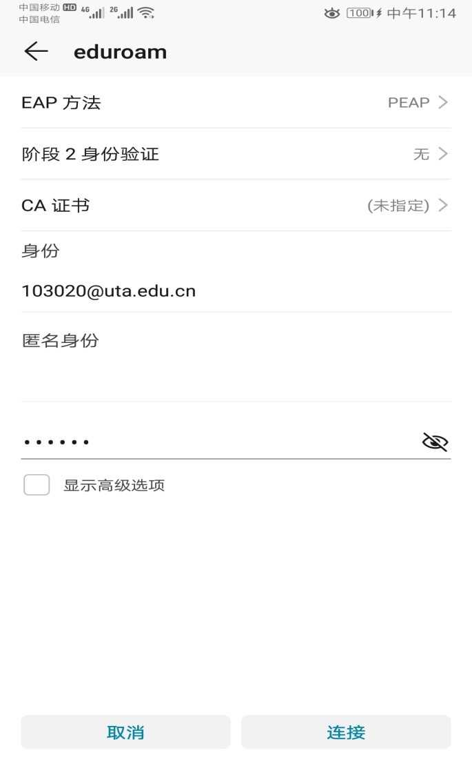 在弹出的eduroam认证窗口中的身份和密码处输入我校的上网账号和密码,其他地方使用默认配置,点击“连接”即可连接上网。