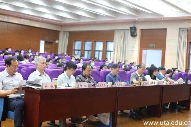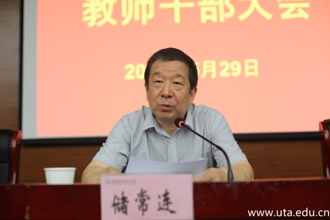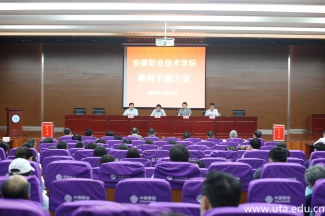 本网讯(党委组织部通讯员 王叶宏)5月29日上午,学院在图书馆三楼学术报告厅召开干部教师大会。第二考核组组长、省教育厅副厅长储常连,考核组副组长、省教育厅高教处处长梁祥君,考核组成员武庆鸿、杨修顺、史会民、张秀华、任雯君出席会议,学院领导班子成员、机关部门领导成员、院部党政正职(含主持工作的副职)、教代会执委、副高以上职称人员和学生代表200人参加会议。会议由党委书记亓四华主持。