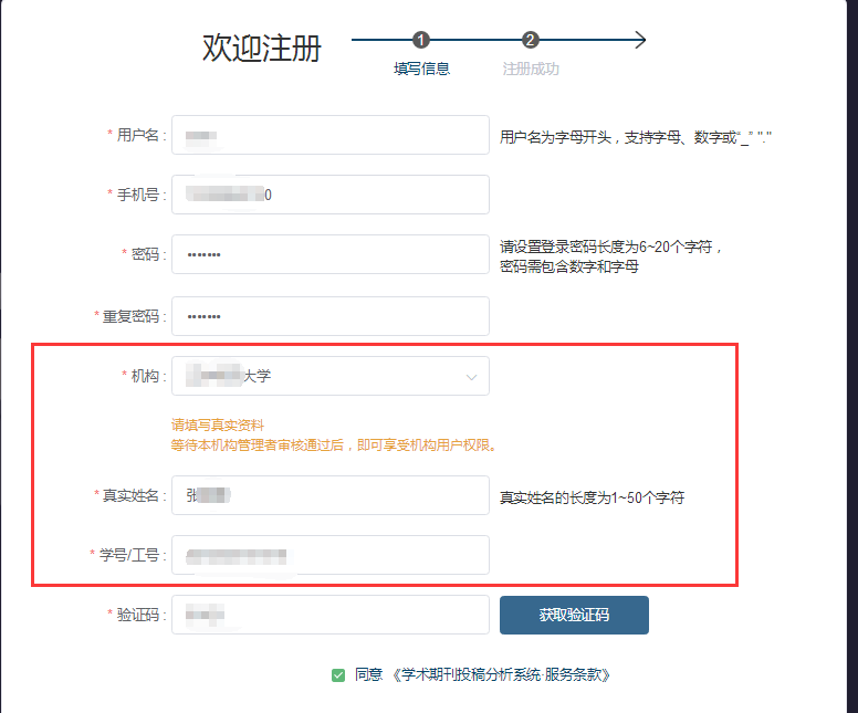 本校用户注册时,在机构处搜索并选择我校机构(也可在个人中心-申请认证),并填写真实姓名和学号或工号,我方会在第一时间审核并通过(需退出后重新登录)。认证后的本校作者将获得机构使用权限。