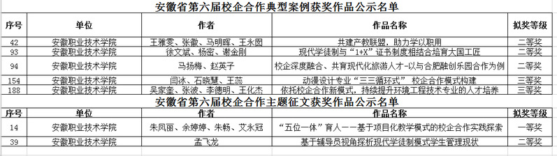 本网讯(实训中心通讯员 吴家奎)日前,第六届安徽省职业教育校企合作典型案例征集和主题征文评选获奖结果揭晓,朱凤丽等4位老师在主题征文中获得一等奖,孟飞龙老师获得二等奖;在典型案例中王雅雯、徐文斌、马杨梅等9位老师获得二等奖,闫冰、吴家奎等7位老师获得三等奖。