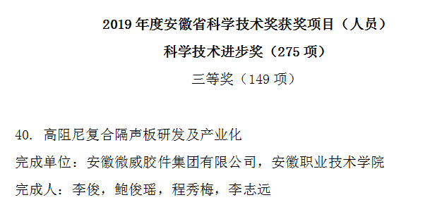 本网讯(科研处通讯员 余顺)近日,安徽省科学技术奖励大会在合肥召开,会上发布了2019年度安徽省科学技术奖获奖名单。我校鲍俊瑶教授的科研成果《高阻尼复合隔声板研发及产业化》喜获安徽科学技术进步奖三等奖,前期该成果还获得《2019年度环境技术进步奖》二等奖。这也是鲍俊瑶教授第二次获得省级科技进步奖。