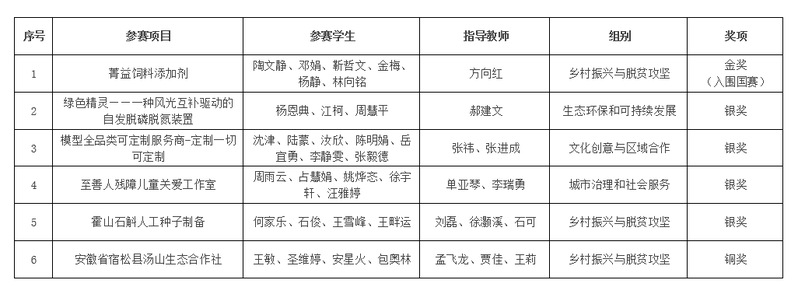 自大赛6月启动以来,我校高度重视比赛,院团委、各二级学院线上积极宣传,广泛动员学生挖掘参赛项目,并通过线上申报、专家盲评的方式遴选优秀项目,从35个作品中推报6个作品进入省赛,其中3个项目晋级终审决赛,涵盖乡村振兴与脱贫攻坚、生态环保与可持续发展、文化创意与区域合作等多个赛道。最终,我校参赛作品《菁益饲料添加剂》荣获大赛金奖并晋级国赛,《绿色精灵——一种风光互补驱动的自发脱磷脱氮装置》等4项作品荣获大赛银奖,《汤山生态合作社》作品荣获大赛铜奖。