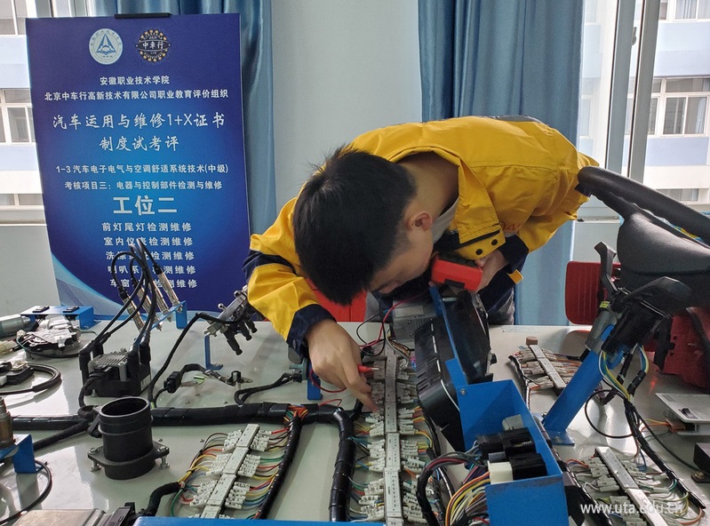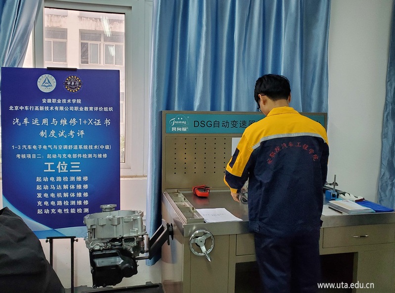 本网讯(汽车工程学院通讯员 田晓雪 实训中心通讯员 吴家奎)为进一步落实教育部等四部门印发的《关于在院校实施“学历证书+若干职业技能等级证书”制度试点方案》,10月31日至11月1日,汽车工程学院和校实训中心在能源校区开展汽车专业领域“1+X”证书第二次试点考评。本次考评由合肥职业技术学院汽车学院院长解云进行督导,实训中心主任冯本茹、汽车工程学院院长姚道如、党总支书记何晓皖进行了巡考,聘请企业和院校专家8人担任考评员,128名学生参与考评。考评期间,党委委员、组织部长杨林国多次亲临现场巡视。