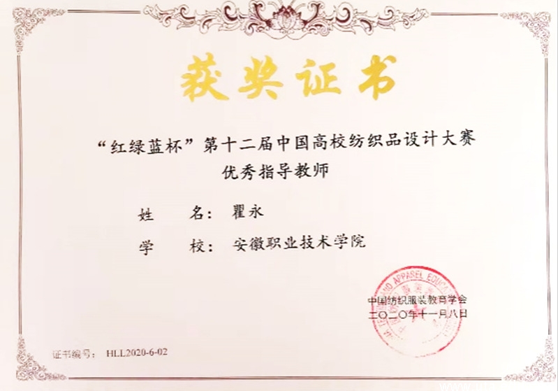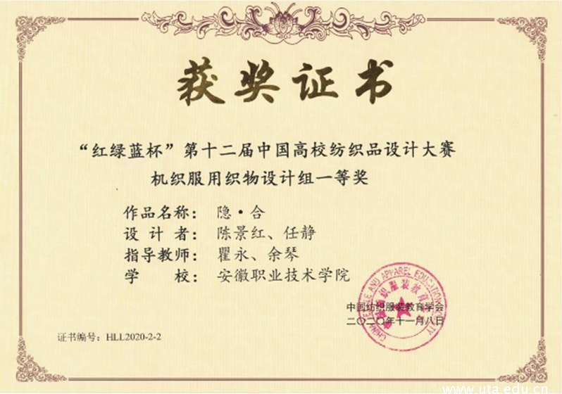 本网讯 (纺织服装学院通讯员 余琴)11月11日,“红绿蓝杯”第十二届中国高校纺织品设计大赛比赛结果揭晓,我校纺织服装学院陈景红、郝雨欣、陈林芝等同学组成的代表队分别获得了一等奖3项,二等奖1项,三等奖2项的好成绩,瞿永教授荣获大赛“优秀指导教师”的荣誉称号。