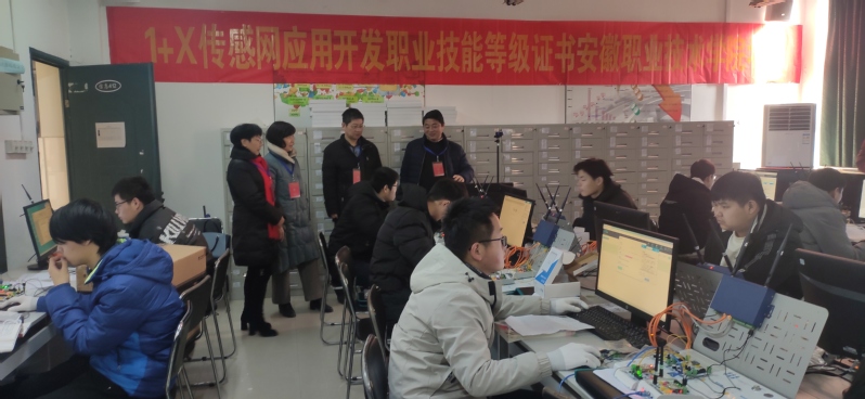 “1+X”传感网应用开发职业技能等级考试由理论与实操两部分组成。证书全面考查了学生利用485总线、Can总线和Zigbee、WiFi、NB-IoT、LoRa等无线组网技术进行传感网应用开发的综合能力。作为安徽省“1+X”传感网应用开发职业技能等级证书的牵头院校和考核站点,本次考核除了本校29名19级物联网技术与应用专业的学生参加外,同时也为合肥职业技术学院29名专业学生提供了证书考试的服务和保障。