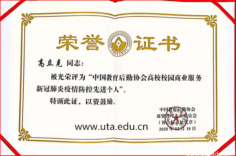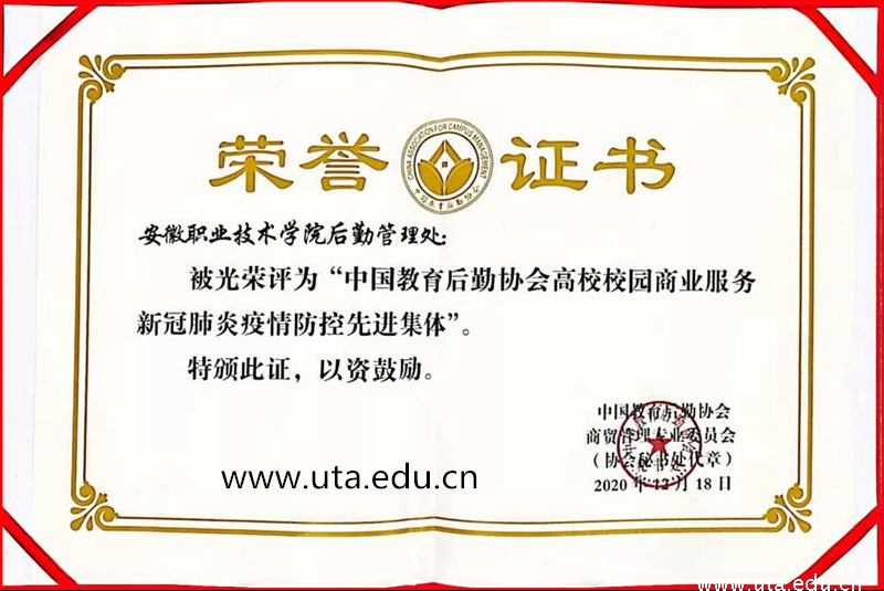 2020年11月省“商专会”下发了《关于开展“全省高校校园商业服务新冠肺炎疫情防控先进集体与先进个人”评选暨推荐参评全国先进集体与先进个人工作的通知》,我校后勤管理处根据通知要求,积极准备抗疫材料进行自主申报,经省“商专会”专家评审,我校后勤管理处及后勤管理处副处长高立克分别被评为安徽省高校校园商业服务新冠肺炎疫情防控“先进集体”和“先进个人”。经省“商专会”推荐,全国“商专会”专家评审,最终被全国高校校园商业务新冠肺炎疫情防控“先进集体”和“先进个人”。