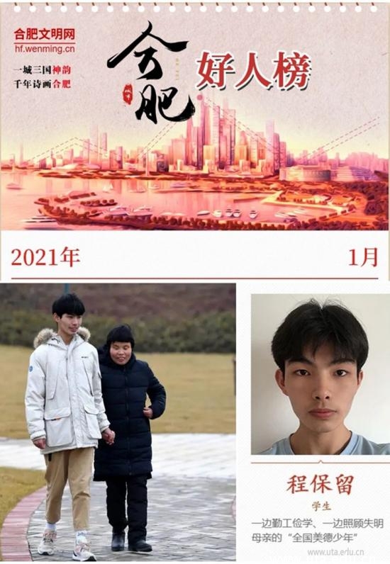 本网讯(纺织服装学院通讯员 钟静 李银萍)日前,由合肥市精神文明建设指导委员会办公室主办的“合肥好人榜”揭晓,我校纺织服装学院现代纺织技术专业1921班程保留同学荣获2021年1月份“合肥好人”荣誉称号,这是程保留继荣获“全国美德少年”荣誉之后获得的又一殊荣,评审结果于3月22日在合肥文明网公布。