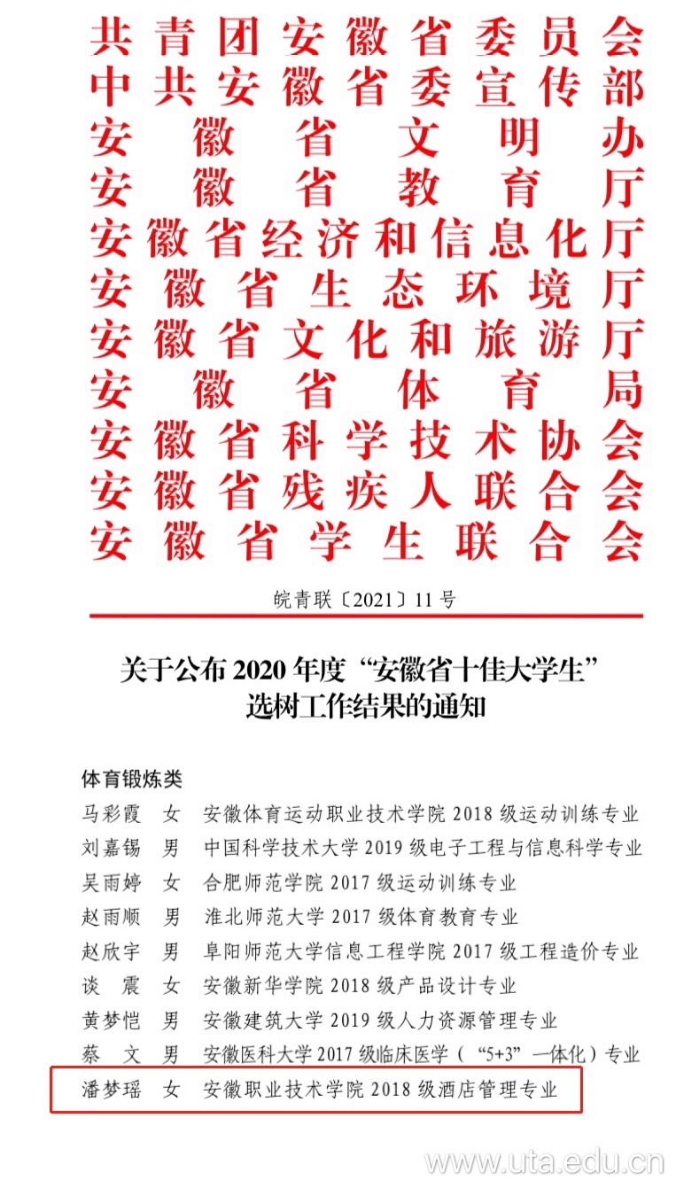 本网讯(管理学院通讯员 秦杨)近日,由省委宣传部、省教育厅、团省委、省文明办等十一家单位联合组织开展的2020年度安徽省“十佳大学生”、“百优大学生”评选结果揭晓,管理学院2018级酒店管理专业学生潘梦瑶荣获“百优大学生”(体育锻炼类)荣誉称号。