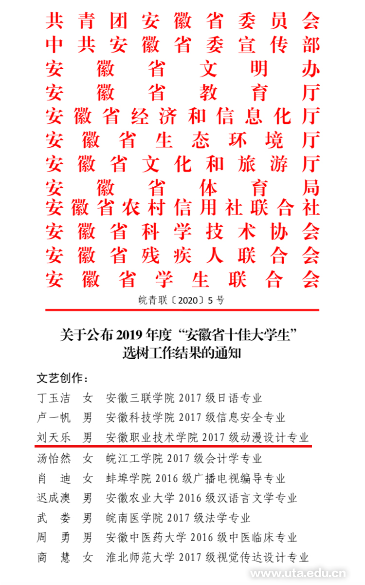 (本网讯 艺术设计学院通讯员 杨哲)近日获悉,由团安徽省委、安徽省委宣传部、安徽省文明办、安徽省教育厅等11家单位联合下发《关于公布2019年度“安徽省十佳大学生”选树工作结果的通知》发布,艺术设计学院2020届毕业生刘天乐荣获“安徽省优秀大学生”(文艺创作类)荣誉称号。