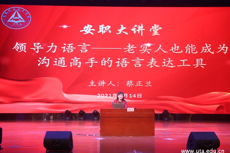 本网讯(院团委 王亮)4月14日下午,“安职大讲堂”首场报告会成功举办。安徽艺术学院蔡正兰教授应邀为我校大学生做题为《领导力语言——老实人也能成为沟通高手的语言表达工具》的主题演讲,讲座设主、分会场,近1500名学生参加,激起了广大大学生强烈共鸣。党委委员、副校长陈行主持报告会,院团委、科研处负责人、各二级学院团总支书记参加报告会。