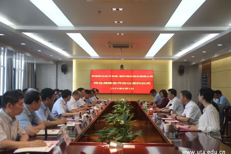 本网讯(实训中心通讯员 冯本茹 王炎)6月1日上午,学院与国轩高科股份有限公司在图文信息中心第一会议室举行了校企战略合作协议签约仪式。省委第七巡视组组长章石生、副组长刘云和巡视组成员朱伟出席了仪式。合肥新站高新区党工委书记、管委会主任王连贵,经贸发展局局长曾艳,国轩高科股份有限公司董事长李缜,副总裁马桂富,学院党委书记李方泽,党委副书记、校长孙敬华,党委副书记、纪委书记郭淼,党委委员、副校长陈行,党委委员、基础教学部主任马纯,党委委员、组织部部长杨林国,国轩高科股份有限公司和学院相关部门负责人参加了签约仪式。