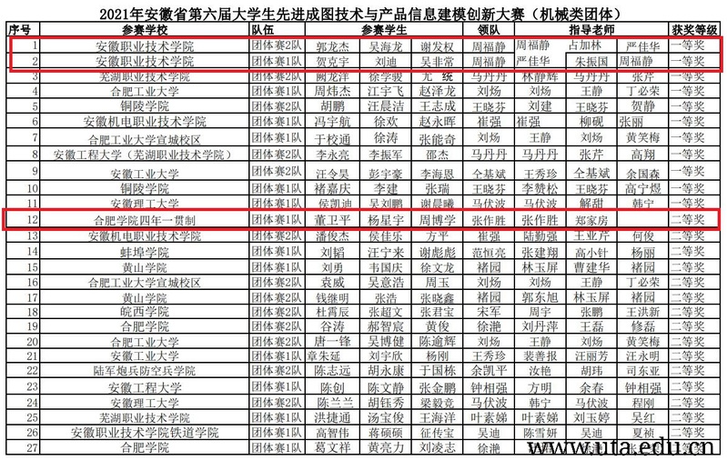 本网讯(机械工程学院通讯员 周福静)5月29日,第六届安徽省大学生先进成图技术与产品信息建模创新大赛以网络竞赛形式举行。我校两支高职代表队以总分第一、二名的成绩荣获团体一等奖,“四年一贯制“本科队荣获团体二等奖;同时荣获尺规绘图和三维建模个人赛一等奖7个,二等奖7个,三等奖3个,再创历史新高。