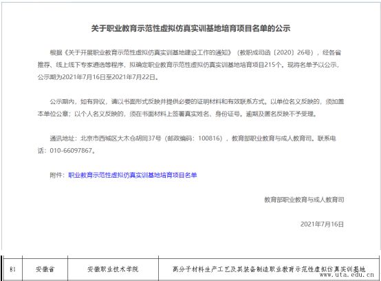 据了解,此次全国共确定职业教育示范性虚拟仿真实训基地培育项目215个,安徽省共入选8个。