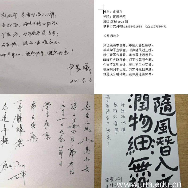 手写祝福谢师恩。9月4日至9月7日,院团委联合党委宣传部开展了教师节祝福语征集活动。同学们通过评论区留言、拍摄图片、制作祝福小视频、创作诗歌、手写祝福语等形式,向老师们表达诚挚敬意与衷心祝福。一笔一划铭刻着深深的感恩,一言一语凝结浓浓的深情。大家亲手写下对老师的感恩之情,感谢他们默默耕耘、无私奉献的辛勤工作。