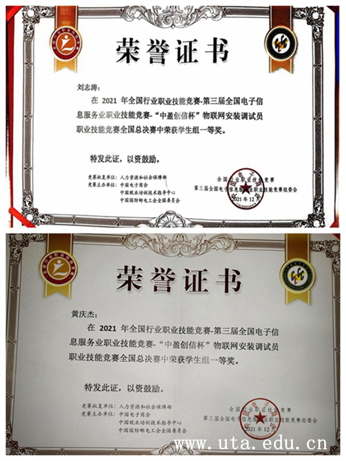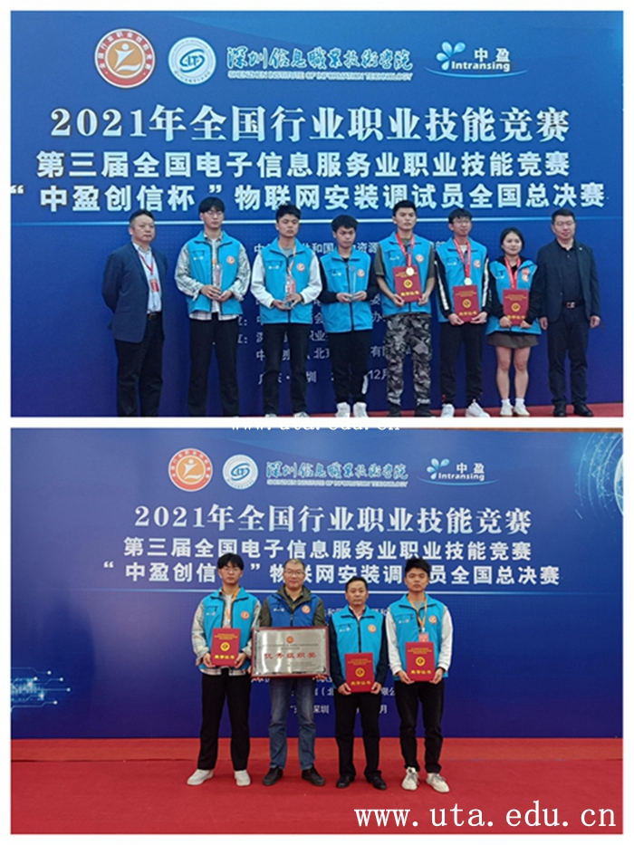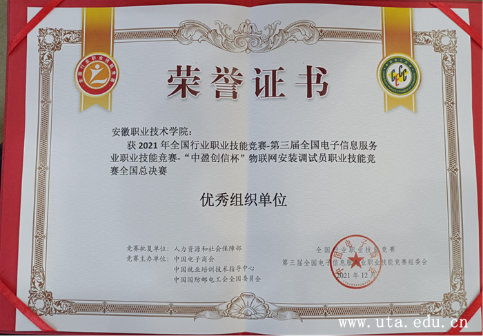 本网讯(机电工程学院通讯员 马卫民)2021年全国行业职业技能竞赛·第三届全国电子信息服务业职业技能竞赛·“中盈创信杯”物联网安装调试员职业技能竞赛全国总决赛,于12月10日-12月12日在深圳信息职业技术学院举行,我校机电工程学院学子黄庆杰、刘志涛同学荣获全国总决赛一等奖,我校荣获“优秀组织奖”。