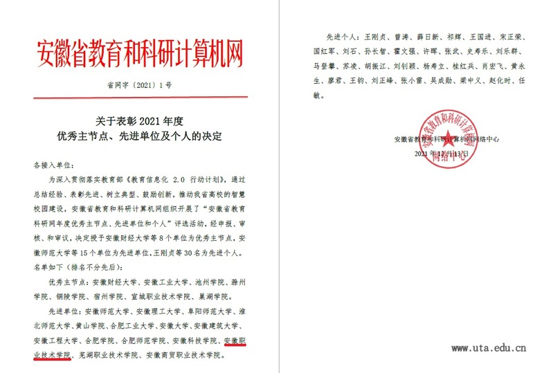 本网讯 (网络信息中心通讯员 周朝红)近日,安徽省教育和科研计算机网网络中心对2021年高校信息化工作建设作出优异成绩的高校和个人进行了表彰,我校被授予安徽省教育和科研计算机网“2021年度先进单位”。