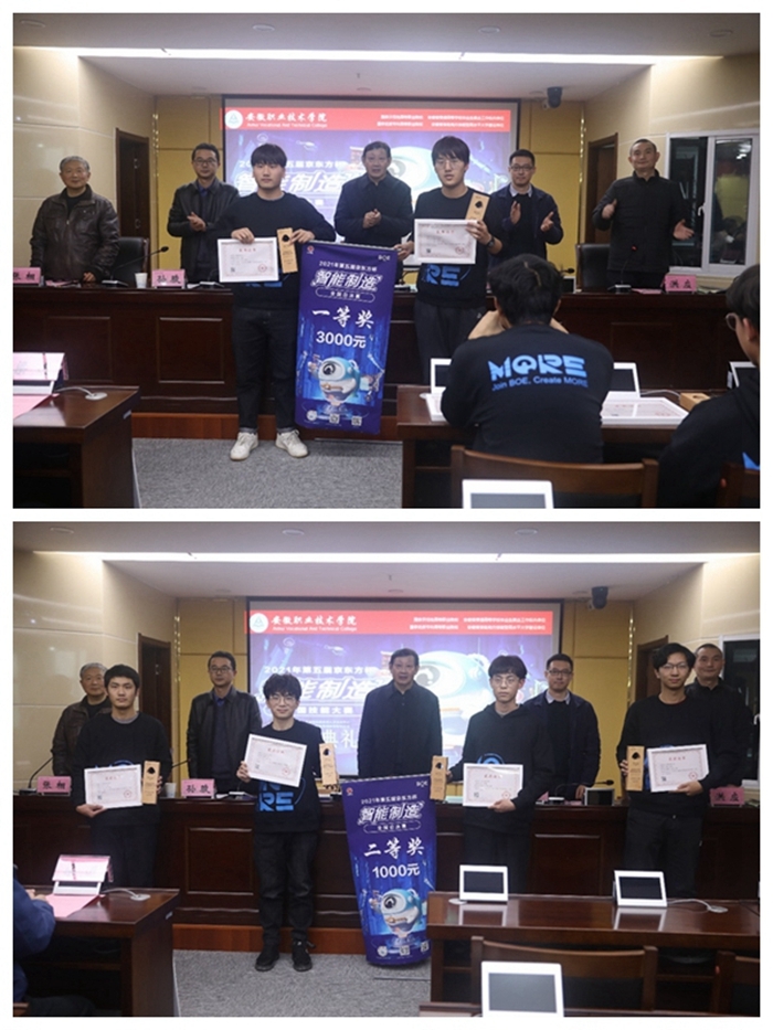 12月15日,学院在图文信息中心9楼视频会议室为荣获第五届“京东方杯”智能制造技能大赛全国总决赛获奖学生举行颁奖仪式,党委副书记、院长孙敬华为获奖学生颁奖。合肥京东方显示技术有限公司人力资源部部长朱锡坤,招聘经理梁进、凌达,机电工程学院党总支副书记孙骏,副院长洪应、张栩参加颁奖仪式。洪应主持颁奖仪式。