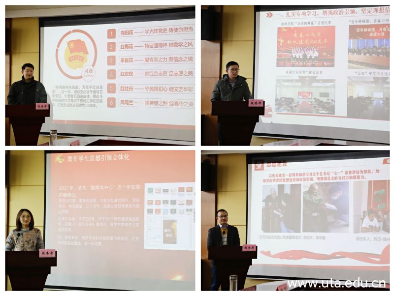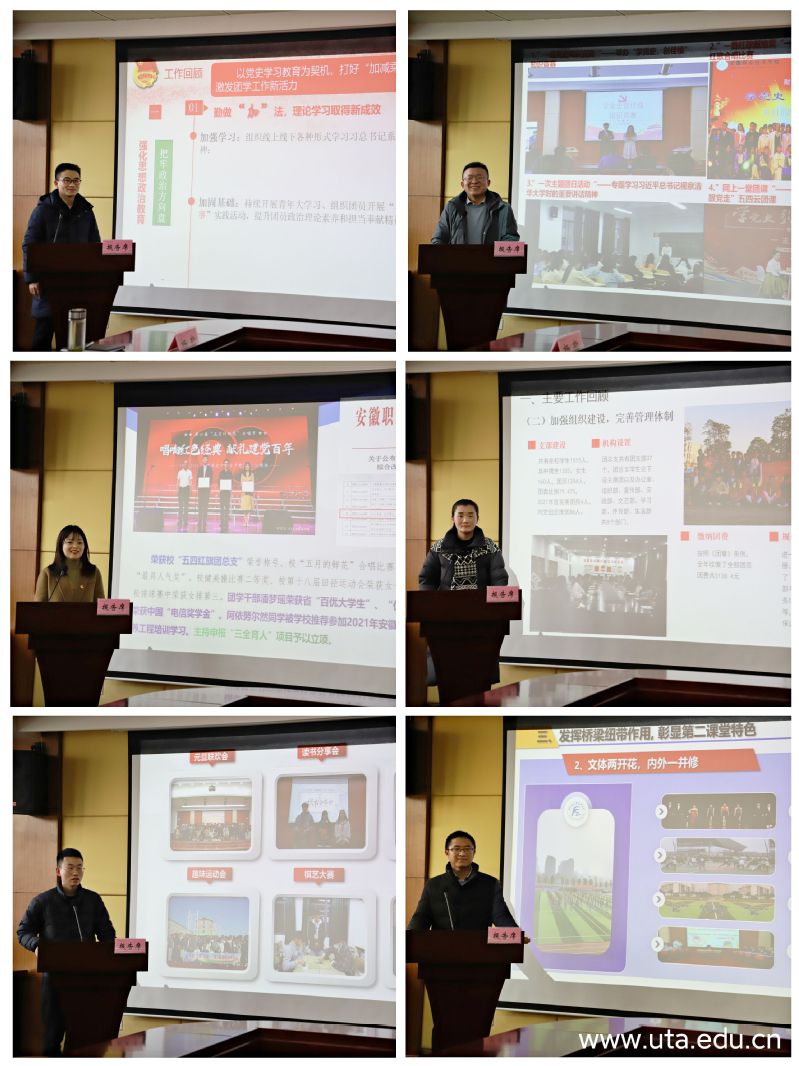 本网讯 (院团委通讯员 石可 刘心洁)为不断深化共青团改革,充分发挥团总支作用,增进团学工作经验交流,2月23日下午,学院在图文信息中心十楼会议室召开2021年度团总支考核现场述职交流会。党委委员、副院长宣岩松到会指导,体育健康学院党总支书记张在腾、马克思主义学院党总支负责人钱洁、学生处负责人李瑞勇、保卫处负责人李仿民出席会议并担任评委。院团委全体人员,各二级学院团总支书记、团总支副书记参加会议,会议由院团委负责人余搏立主持。
