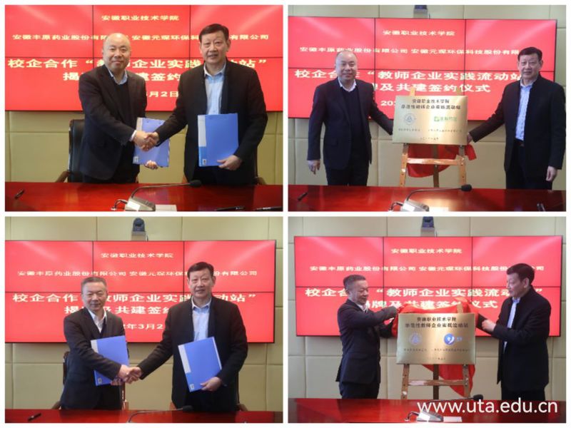 本网讯(科研处通讯员 方向红 窦静)3月2日上午,学院与安徽丰原药业股份有限公司、安徽元琛环保科技有限公司在图文信息中心九楼会议室举行教师企业实践流动站揭牌暨共建签约仪式。党委副书记、院长孙敬华,党委委员、副院长张智清,党委委员、副院长杨林国及人事处、发展规划处、教务处、继续教育学院和科研处等部门负责人参加活动,仪式由张智清主持。