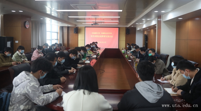 本网讯(教务处通讯员 汪志强)3月23日下午,学院在图文信息中心十楼会议室召开专升本联合培养学生座谈会。党委委员、副院长杨林国,教务处、学生处等部门负责人及安徽建筑大学教务处、学生处相关负责同志出席了会议,各专升本联合培养班学生代表参加了会议。会议由杨林国主持。