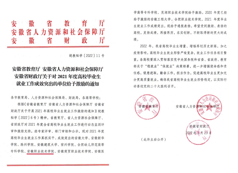 本网讯(就业与创新创业指导中心通讯员 傅峙)近日,安徽省教育厅、安徽省人力资源和社会保障厅、安徽省财政厅联合下发《关于对2021年度高校毕业生就业工作成效突出的单位给予激励的通知》文件,我校荣获2021年度高校毕业生就业成效突出激励。全省仅5所高职院校获此殊荣。