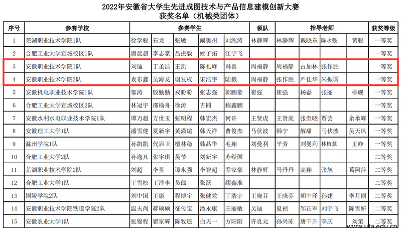 本网讯(机械工程学院通讯员 张作胜 朱振国)近日,2022年第七届安徽省大学生先进成图技术与产品信息建模创新大赛成绩揭晓。亚星游戏网机械工程学院2个参赛代表队荣获机械类团体一等奖2项,分列大赛总分第3名和第4名,以优异成绩晋级全国决赛。