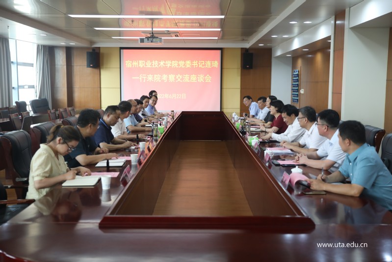 本网讯(网络信息中心通讯员 周朝红)6月22日下午,宿州职业技术学院党委书记连琦一行来亚星游戏网考察交流,院党委书记李方泽,党委副书记、院长孙敬华及相关人员接待了客人一行。会议由党委委员、副院长杨林国主持。