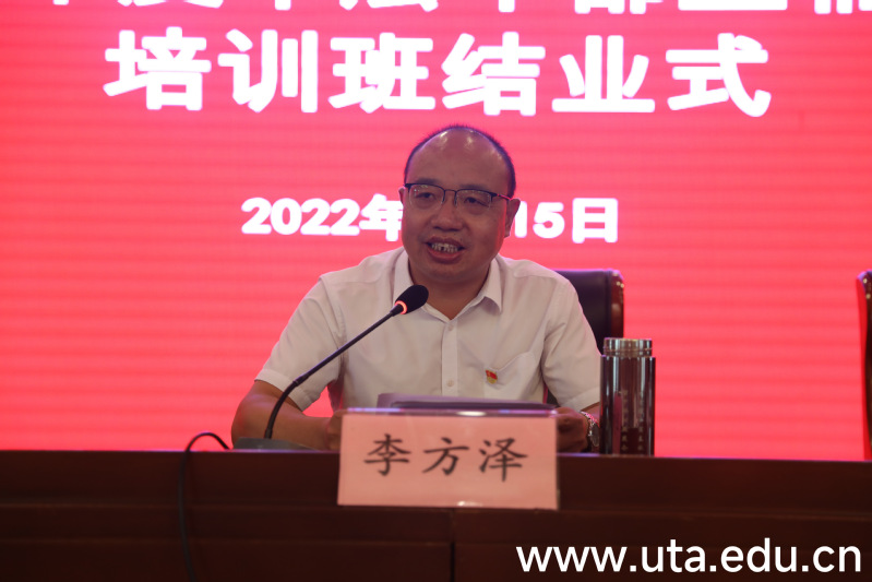 在培训班结业式上,李方泽指出,本次培训既着眼于提升全体中层干部和辅导员的思想政治素质和履职尽责能力,又有效契合了学院创建职教本科的实际需要,达到了启发改革思维、锤炼党性修养、凝聚思想共识的良好效果。就进一步巩固学习培训成效,李方泽提出四点要求:一要提高政治站位,砥砺党性修养,践行初心使命;二要持续加强学习,厚实理论功底,提升理论素养;三要注重学用转化,提升履职能力,练就过硬本领;四要加强自身建设,改进工作作风,强化责任担当。