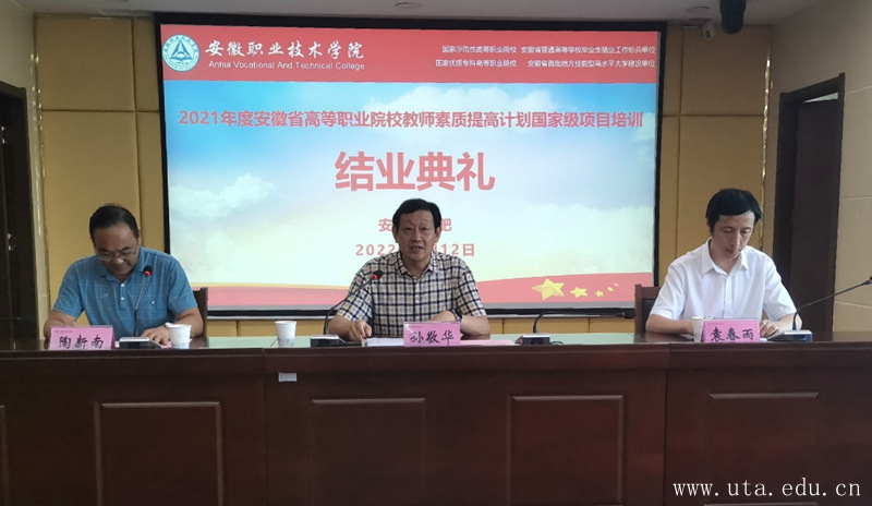 本网讯(智能制造学院通讯员 郝进平)8月12日上午,学院在图文信息中心九楼会议室举行2021年度安徽省高等职业学校教师素质提高计划国家级项目培训班结业典礼。学院党委副书记、院长孙敬华出席结业典礼并讲话。教务处处长袁春雨,相关二级学院党政负责人,班主任和来自全省36所高职院校58位学员参加了典礼。典礼由智能制造学院党总支书记陶新南主持。