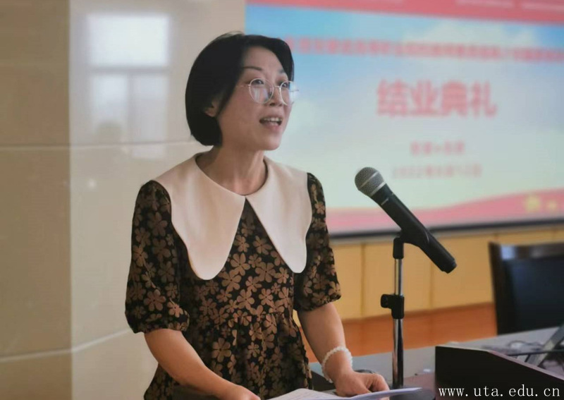 会上,安徽工贸职业技术学院王琳老师代表全体参训学员作交流发言。她回顾了培训期间的学习生活,表达了对二十多天的培训生活的依依不舍之情,对授课老师和管理服务人员表示衷心的感谢。她表示,一定会把国培期间学到的新知识、新理念、新技术运用在实际的教育教学工作中,为职业教育事业发展贡献自己的一份力量。