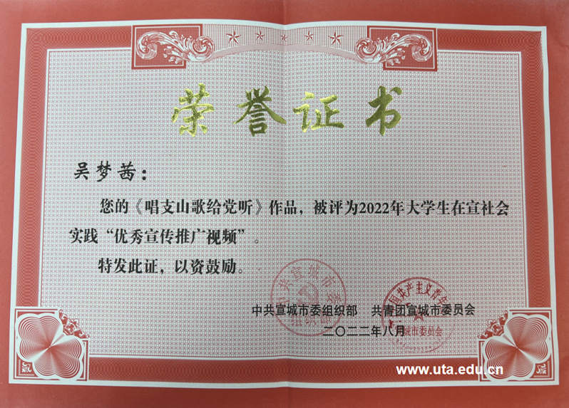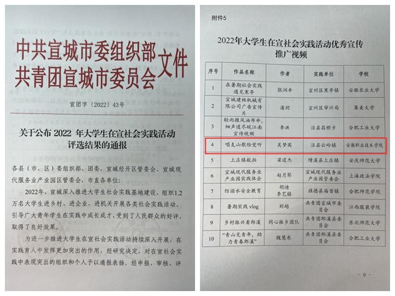 本网讯(团委通讯员 吕玥)8月12日,由宣城市委组织部、团市委主办的2022年大学生在宣社会实践工作表彰总结会在宣城召开,亚星游戏网“三下乡”社会实践活动宣城支队作品《唱支山歌给党听》被评为“优秀宣传推广视频”。