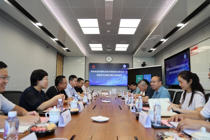李方泽一行在华为安徽政企业务副总经理林健的带领下参观了企业的文化墙、展示区、休闲区等区域,详细了解了公司发展历程、企业文化、发展理念和合作业务等情况。随后,双方就校企合作、人才培养等事宜开展了讨论。