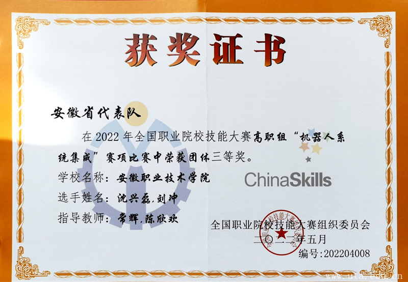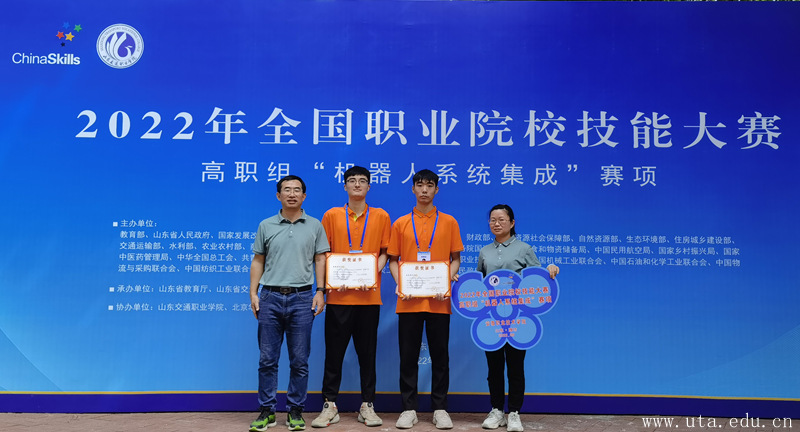 本网讯 (智能制造学院通讯员 常辉 陈欣欢)8月15日至18日,2022年全国职业院校技能大赛高职组“机器人系统集成”赛项在山东交通职业学院举行。来自全国28个省市、自治区52支参赛队参加了此次比赛,经过激烈角逐,我校智能制造学院沈兴磊、刘冲两位同学在常辉、陈欣欢两位老师的悉心指导下,以总成绩第16名获得全国三等奖。